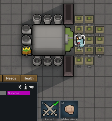 The dispenser has a minor quirk - because colonists have to dispense meals as needed, they will never carry meals in their inventory. By preventing outdoor snacking, it forces colonists to eat at a nearby dining area, always giving the <Impressive> dining room moodlets while preventing −3 Ate without Table. However, this makes colonists slightly less efficient, as they'll have to travel to the dispenser every time they want to eat. It's also worth noting that having hoppers filled with food in the dining room will cause the room to count is a "Storeroom" which will stop pawns from receiving the positive dining room moodlet. If the hoppers are empty the room will count as a "Dining room".